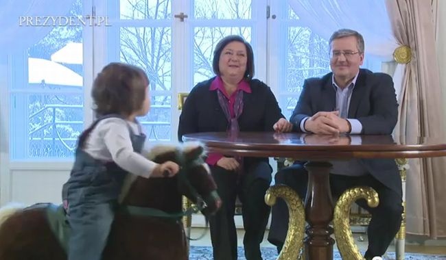 "Z okazji naszego wspólnego święta życzymy państwu, żeby - tak jak my mamy dzisiaj radość być razem z Hanią - państwo też cieszyli się wnukami i ich obecnością, i mieli satysfakcję z tego, jak wnuki rosną i żeby one dostarczały dużo, dużo radości" - mówi na nagraniu Anna Komorowska. "Tak jak nam dostarczają" - dodaje prezydent.
