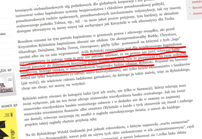 - Jeśli Rybiński rzeczywiście jest dla współczesnego kapitalizmu reprezentatywny (a patrząc wam w oczy nie potrafię skłamać, że na pewno nie jest), wówczas będę musiał powrócić do dziecięcych fascynacji grupą Baader-Meinhof, tyle że pierwszym i na razie jedynym bankierem, którego zamknę w samochodowym bagażniku będzie właśnie Rybiński – napisał w felietonie „Nie ma wroga w centrum, nawet przesuniętym w prawo” Cezary Michalski. Odnosił się w ten sposób na założenie przez ekonomistę, prof. Krzysztofa Rybińskiego funduszu inwestycyjnego Eurogeddon. Zdaniem publicysty spekuluje on na upadek strefy euro.