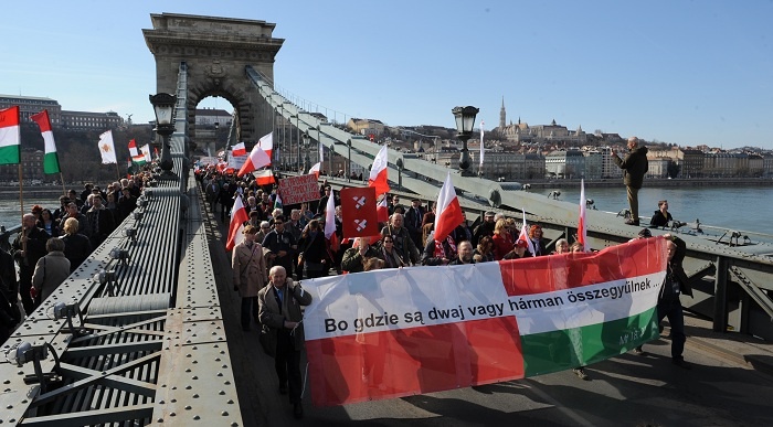 Polacy, wraz z Węgrami, po południu wzięli udział w przemarszu z Góry Zamkowej pod budynek parlamentu. Nieśli polskie i węgierskie flagi, a także transparenty z napisami: "Niech żyje premier Viktor Orban", "Boże, błogosław Węgrów", "Wiwat Orban" i "Budapeszt-Warszawa wspólna sprawa".