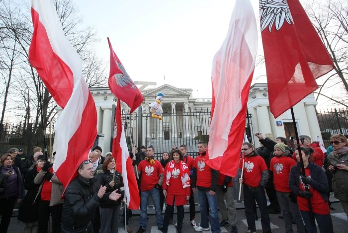 Manifestacja będąca sprzeciwem wobec "sposobu prowadzenia śledztwa ws. katastrofy smoleńskiej" odbywa się w poniedziałek, w przeddzień drugiej rocznicy katastrofy, przed ambasadą rosyjską w Warszawie.