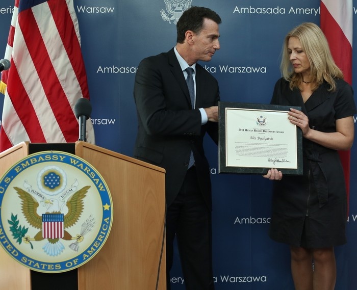 Ambasador USA w Polsce Lee A. Feinstein w imieniu amerykańskiej sekretarz stanu Hillary Clinton wręczył we wtorek w Warszawie nagrodę dla obrońców praw człowieka (Human Rights Defenders Award) przyznaną białoruskiemu opozycjoniście Alesiowi Bialackiemu.