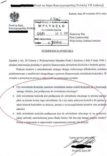 Ostatnio bardzo aktywna jest grupa osób związana z Ruchem Palikota i ich lokalnym posłem (nazwiska nie podaje, bo i po co, z resztę nie ma sensu reklamować kogoś, kto na ziemi radomskiej tylko bywa) - w każdym razie tym posłem, co przed wyborami obiecywał wybudowanie toru Formuły 1 w Radomiu. O co pytają „palikotowcy”? A to ile kosztuje oświetlenie ulic wokół kościołów, a to ile kosztuje nauczanie religii. Zamiast wziąć się za realizację kampanijnego postulatu budowy toru Formuły 1 wzięli się za Kościół katolicki, zapominając, że nauczanie religii wynika z ratyfikowanej umowy międzynarodowej – Konkordatu. Uczestnictwo w lekcjach religii nie jest obowiązkowe i mimo, że sam nie kryję swojego przywiązania do Kościoła rzymskokatolickiego, pierwszy bym stanął w obronie szykanowanych z powodu nieuczęszczania na religie. Ale takich szykan nie ma, mimo że są przecież uczniowie co nie chodzą na lekcje religii. Uczestnictwo w lekcjach religii to każdego osobista sprawa i nikt nie może wywierać na nikogo presji. Póki co dzieci i młodzież gimnazjalna na religię chodzą i dopóki chodzą lekcje religii na podstawie obowiązujących przepisów są opłacane z budżetu państwowego. Panom „palikotowcom” polecam wiec douczenie się prawa. A jeśli bardzo chcą zmian to niech wygrają wybory (w co wątpię i czego im z całego serca nie życzę). Wtedy ewentualnie mając większość w Sejmie zmienią prawo (polecam też wygrać wybory na prezydenta, by zmian nie zawetował). A tymczasem nich nie zakłócają swoimi wysyłkami pracy samorządów. Szanuję przepisy dotyczące dostępu do informacji publicznej, ale pewne rzeczy są oczywiste. No, ale jak nie są w stanie spełnić swoich postulatów wyborczych, to szukają dziury w całym, dla odwrócenia uwagi od swoich niepowodzeń. Ulice wokół obiektów sakralnych są oświetlane na ogólnych zasadach. Nawet w zlaicyzowanej Europie, gdzie Kościół katolicki praktycznie sprawdzono do podziemia, władze państwowe/samorządowe budują specjalne iluminacje, w celu oświetlania kościołów - jako zabytków. U nas w Jedlni-Letnisku jest śliczny zabytkowy kościół, który jest wizytówką i jednym ze znaków rozpoznawczych naszej gminy. W swojej już chyba nienawiści do Katolików „palikotowcy” nawet nie pomyśleli, że dodatkowe oświetlenie takiego kościoła w nocy, dla wierzących i chodzących do kościoła nie ma kompletnie żadnego znaczenia, natomiast ma znaczenia z punktu widzenia atrakcyjności miejscowości. Ja, jak i wielu mieszkańców, jestem dumny, że na początku XX wieku mieszkańcy wznieśli taki ładny kościół, a potem przez dziesięciolecia świeccy i duchowni dbali o przetrwanie i wygląd tego obiektu. Tego nie rozumieją autorzy listów i domagają się informacji, ile oświetlenie kosztuje gminę.