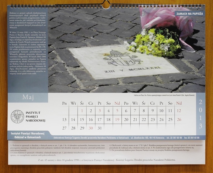 Ilustracyjną warstwę kalendarza, opracowanego merytorycznie przez Ewę Koj oraz Adama Dziuroka, a graficznie przez Marcina Niedurnego, tworzą piękne, nastrojowe zdjęcia. Bardziej wyrażają klimat śledztw, które ilustrują, aniżeli związane z nimi faktami. Dlatego np. śledztwo w sprawie zamachu na papieża, ilustrowane jest zdjęciem pamiątkowej płyty, wmurowanej w bruk Placu Św. Piotra, w miejscu gdzie strzelano do Jana Pawła II, a nie zdjęciami z zamachu. Każdy miesiąc odwołuje się do jednego ze śledztw, prowadzonych przez pion ścigania w Katowicach: styczeń – w sprawie zbrodni popełnionych przez żołnierzy Armii Czerwonej w styczniu 1945 r. na Górnym Śląsku, luty – tworzeniem bazy internowanych i deportowanych do Związku Sowieckiego w 1945 r., marzec – śledztwa w sprawie nacisków na obywateli polskich narodowości żydowskiej w latach 1968-69, aby na stałe opuścili Polskę, kwiecień – deportacji Polaków z Kresów Wschodnich, maj – śledztwa w sprawie zamachu na papieża, czerwiec – zbrodni gestapo na Górnym Śląsku, lipiec – okoliczności katastrofy 4 lipca 1943 r. w Gibraltarze, sierpień – poświęcony jest ofiarom akcji X 2 w ramach której od sierpnia 1954 r. wysiedlono przymusowo 1061 sióstr zakonnych, wrzesień – obrońcom Katowic 1939 r., październik - ofiarom obozów pracy powstałych na Górnym Śląsku w 1945 r. , listopad – śledztwu w sprawie przesiedlenia przez Niemców 17 tys. polskiej ludności z powiatu żywieckiego, grudzień – śledztwu w sprawie wprowadzenia stanu wojennego. Każda strona kalendarza zawiera krótki opis śledztwa, jego rezultaty oraz podstawę prawną.