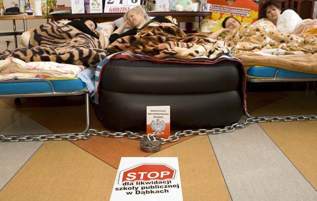 W zespole szkół w Dąbkach uczy się 236 dzieci. Wójt gminy Darłowo chciał, żeby likwidowane placówki przejęło stowarzyszenie i prowadziło jako szkoły niepubliczne. Zdaniem protestujących takie przekształcenie nie gwarantowało ani dotychczasowego poziomu nauczania, ani dalszego istnienia szkoły, która znajduje się na atrakcyjnie położonej nadmorskiej działce. Poparli ich związkowcy i kuratorium oświaty.