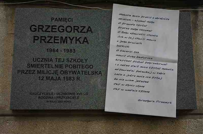 12 maja 1983 r. Przemyk wraz z przyjacielem Cezarym F. świętował na pl. Zamkowym egzamin maturalny. Zatrzymany przez MO, na pobliskim komisariacie przy ul. Jezuickiej otrzymał ponad 40 ciosów pałkami po barkach i plecach oraz kilkanaście ciosów łokciem lub pięścią w brzuch. Przewieziony do szpitala, zmarł 14 maja w wyniku ciężkich urazów jamy brzusznej.