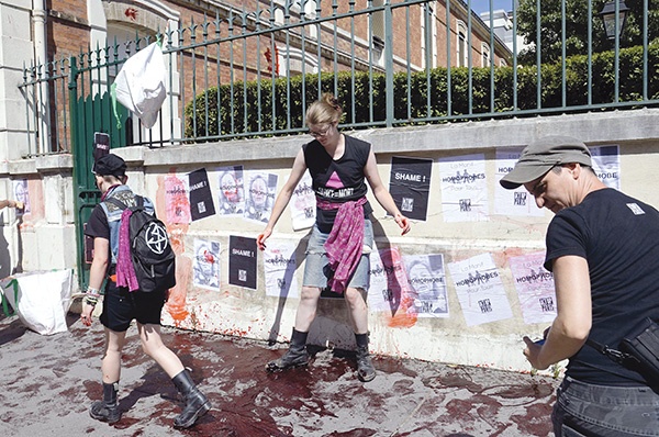 Wieczorem 4 sierpnia francuscy telewidzowie mogli zobaczyć działaczy gejowskich w akcji dzięki obecnym na miejscu kamerom AFP – Francuskiej Agencji Prasowej. Nie było to więc działanie całkiem „niespodziewane”, jak później sugerowały media. Bohaterami reportażu byli członkowie bardzo znanej organizacji gejowskiej Act Up, oblewający czerwoną farbą (mającą symbolizować przelaną krew) paryską siedzibę katolickiej Fundacji Jérôme’a Lejeune’a. Potem budynek i ogrodzenie wysmarowano czerwonym klejem, by oblepić mury plakatami z obraźliwymi napisami, piętnującymi „karygodną homofobię” ich adresata.