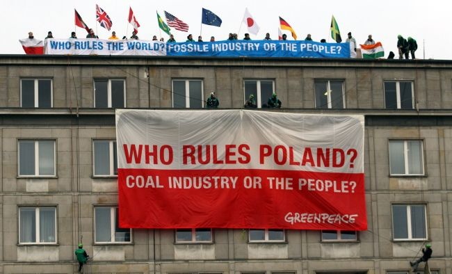 Działacze Greenpeace weszli na dach budynku MG z transparentem "Kto rządzi Polską? Przemysł węglowy czy obywatele?". Wywiesili też na budynku polską flagę z napisem "Who rules Poland? Fossil industries or the people?" (Kto rządzi Polską? Przemysł paliw kopalnych czy ludzie?).