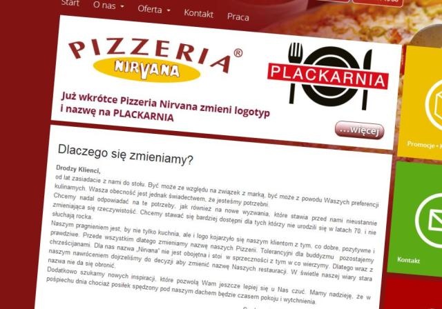 Właściciele lubelskiej sieci pizzerii „Nirvana” zmienili jej nazwę, bo stała w sprzeczności z ich wiarą. Teraz ich lokale noszą swojską nazwę: „Plackarnia”.
