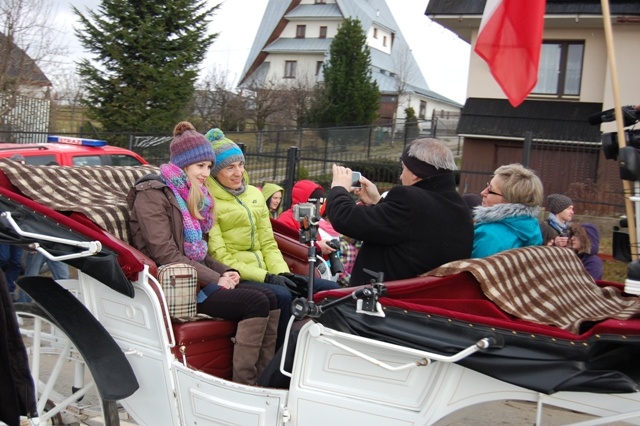 Pomimo niesprzyjającej pogody, na Bachledzkim Wierchu w Zębie zgromadziły się setki osób, a wśród nich oficjalny fan klub Kamila Stocha. Uroczyste powitanie naszego mistrza rozpoczęło się od parady przez Ząb. Dorożkę z Kamilem Stochem i jego żoną Ewą oraz rodzicami poprzedzali jeźdźcy z banderii konnej. Było ich około 100 i trzymali w rękach flagi narodowe.