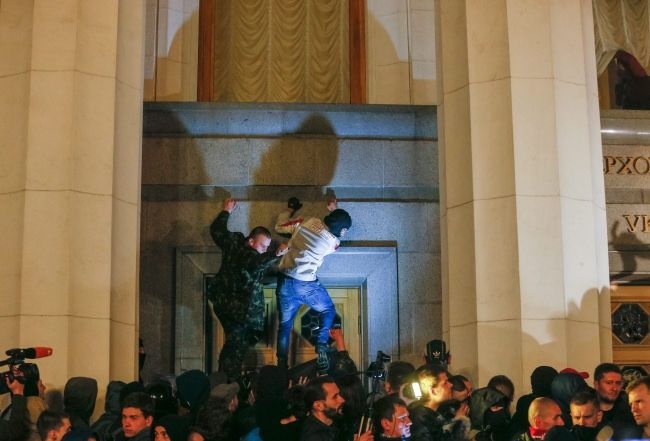 Demonstranci powybijali w parlamencie szyby, walili pałkami w drzwi i przynieśli ze sobą opony. Milicja oświadczyła, że sytuacja jest spokojna, jednak media, które nazwały akcję "szturmem", donosiły o wzmocnionej ochronie Rady Najwyższej. Zwolennicy Prawego Sektora krzyczeli "Rewolucja!".