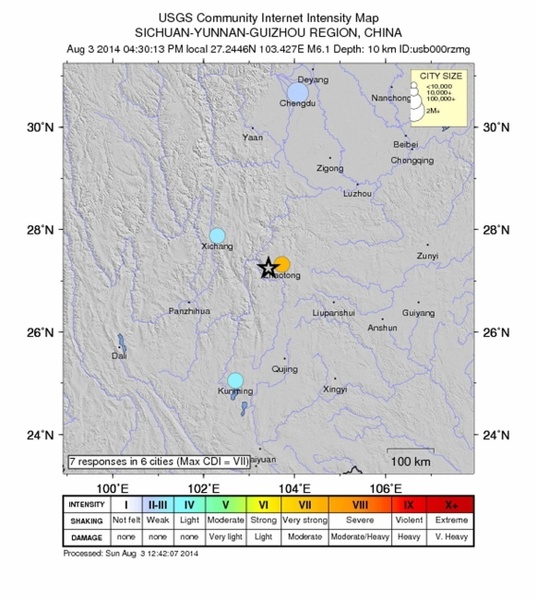Według chiński mediów trzęsienie ziemi było silnie odczuwalne w prowincji Yunnan i nieco słabiej w sąsiednich prowincjach Kuejczou (Guizhou) i Szyczuan (Sichuan).