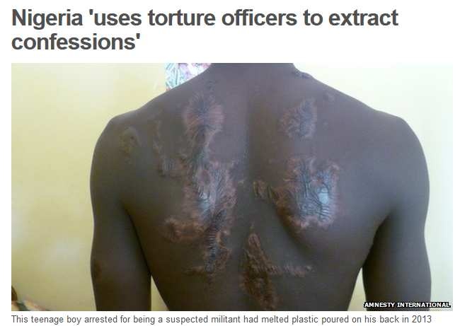 AI przywołuje przypadek 15 letniego chłopaka, aresztowanego w zeszłym roku w Pokiskun w stanie Yobe, podejrzanego o bycie członkiem Boko Haram. Spędził on 3 miesiące w areszcie w miejscowości Damaturu, gdzie wg zeznań był bity kolbami karabinów, pałkami i maczetami. Na jego plecy wylano stopiony plastik, kazano mu chodzić i tarzać się po rozbitym szkle. Wylewano również na niego i innych zimną wodę.