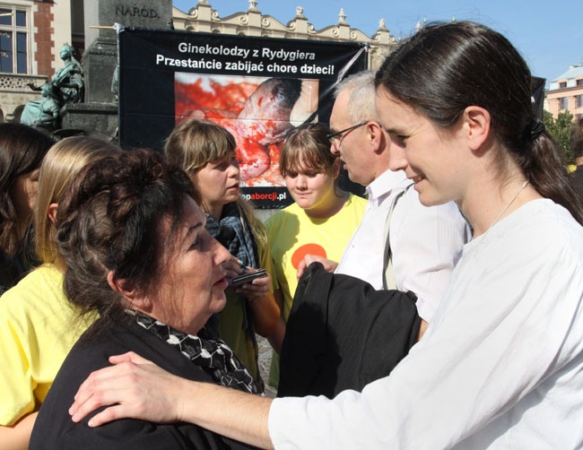 „Przemoc dotyczy kobiet w każdym wieku. Najczęściej zabijane są kobiety przed narodzeniem”; „Aborcja = biznes + kariera”; „Ginekolodzy z Rydygiera, przestańcie zabijać chore dzieci” - transparenty z takimi hasłami trzymali członkowie Fundacji Pro - Prawo do życia, którzy w sobotę 11 października - wraz z Mary Wagner - pojawili się w pobliżu kościoła Mariackiego.
