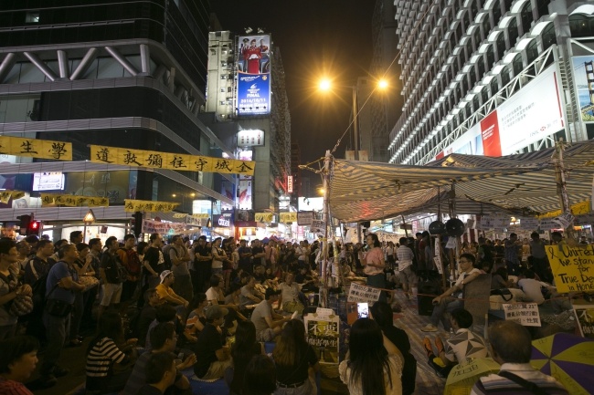Jak relacjonuje agencja Reutera, w stanowiącej centrum protestów dzielnicy Admiralty, w pobliżu siedziby władz, panuje obecnie atmosfera festynu. Pośród drapaczy chmur, na ulicy będącej wcześniej jedną z najbardziej ruchliwych arterii, rozstawiono ok. 200 namiotów. Setki demonstrantów spędziły tam jedną z najspokojniejszych nocy od początku protestów. Pomiędzy przemówieniami niektórzy grali na gitarach, grali w karty czy czytali. W prowizorycznych klasach odbywały się lekcje.