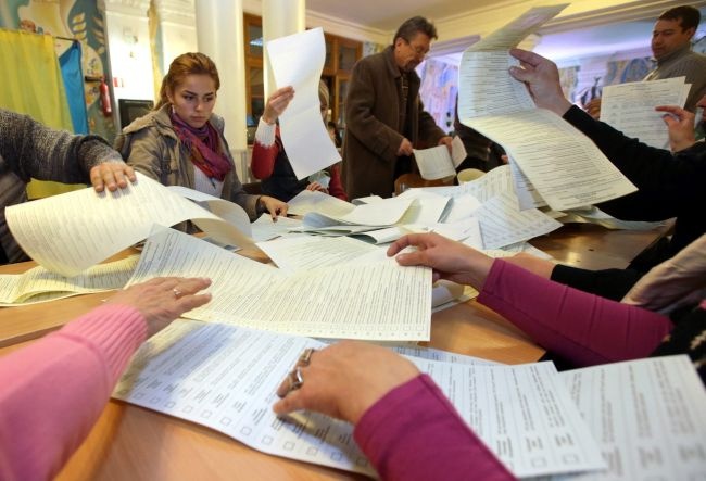 Po podliczeniu 30 proc. głosów w wyborach do Rady Najwyższej Ukrainy prowadzi Front Ludowy premiera Arsenija Jaceniuka (21,71 proc.) przed prezydenckim Blokiem Petra Poroszenki (21,59 proc.), Samopomiczą (Samopomocą) mera Lwowa Andrija Sadowego (10,81 proc.), Blokiem Opozycyjnym (9,6 proc.), Radykalną Partią Ołeha Laszki (7,52 proc.) i Batkiwszczyną b. premier Julii Tymoszenko (5,81 proc.). Pozostałe partie nie przekraczają 5-procentowego progu.