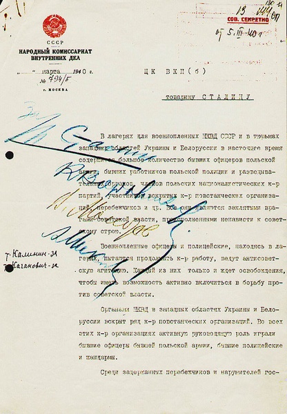Szef NKWD pisał w nim m.in.: "W obozach dla jeńców wojennych NKWD ZSRS i w więzieniach zachodnich obwodów Ukrainy i Białorusi w chwili obecnej znajduje się duża liczba byłych oficerów armii polskiej, byłych pracowników policji polskiej i organów wywiadu, członków nacjonalistycznych, kontrrewolucyjnych partii, członków ujawnionych kontrrewolucyjnych organizacji powstańczych, uciekinierów i in. Wszyscy są zatwardziałymi wrogami władzy sowieckiej, pełnymi nienawiści do ustroju sowieckiego".