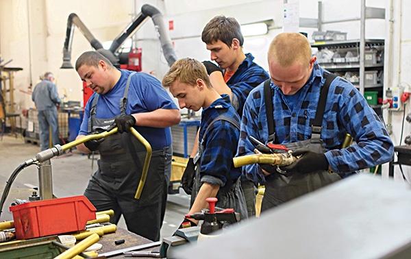 Wfabryce w Bolechowie pod Poznaniem praca wre. Wszędzie stoją konstrukcje autobusów, na różnych etapach produkcji. Na przyklejonych do nich kartkach czytamy nazwy miast: Warszawa, Berlin, Stara Zagora, Lecco... Niektórzy pracownicy produkcyjni noszą pod flanelowymi koszulami pomarańczowe koszulki. To uczniowie. – Nie wyróżniamy ich, chodzi tylko o to, by byli lepiej widoczni. Dla ich bezpieczeństwa – mówi Jacek Pawlik, opiekun uczniów w fabryce. Rzeczywiście, co chwilę spotykamy „pomarańczowych”, którzy wspólnie ze starszymi kolegami piłują lub montują. Albo przyglądają się, jak bardziej doświadczeni pracownicy wykonują swoje obowiązki. Chłopcy to uczniowie Zasadniczej Szkoły Zawodowej w Murowanej Goślinie, oddalonej o 6 km od Bolechowa. Są jednocześnie młodocianymi pracownikami firmy. Dwa dni spędzają w fabryce, kolejne dwa na nauce innych przedmiotów, takich jak język polski czy matematyka, zaś piąty dzień – w zaprzyjaźnionym Zespole Szkół nr 1 w Swarzędzu, w którym uczą się teorii. W przyszłości będą monterami mechatronikami i elektrykami elektromechanikami pojazdów samochodowych. I prawdopodobnie zostaną w firmie. Rok temu z dziesięciu absolwentów szkoły dziewięciu podpisało z Solarisem „dorosłą” umowę o pracę.