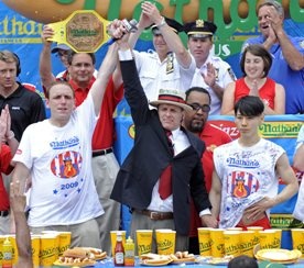 - Amerykanin Joey Chestnut po raz trzeci z rzędu zdobył w sobotę tytuł mistrza świata w jedzeniu hot dogów. Zjadając w ciągu 10 minut 68 bułek z parówką nie tylko ponownie pokonał sześciokrotnego championa z Japonii Takeru Kobayashi'ego, ale ustanowił też nowy rekord świata w tej dziedzinie.