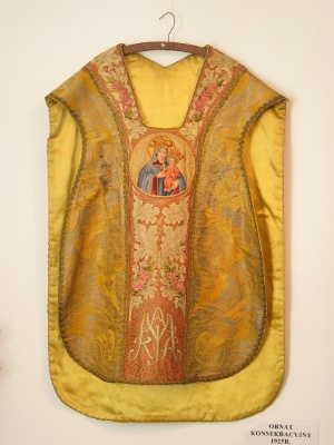 Część tamtejszych szat liturgicznych uszyto np. z ubiorów świeckich - zgodnie ze zwyczajem przekazywania na ornaty królewskich sukien ślubnych. Najstarsze są ornat i kapa uszyta z sukni królowej Bony. Są też dwa ornaty i szata diakona uszyte z sukni królowej Konstancji Hasburżanki.