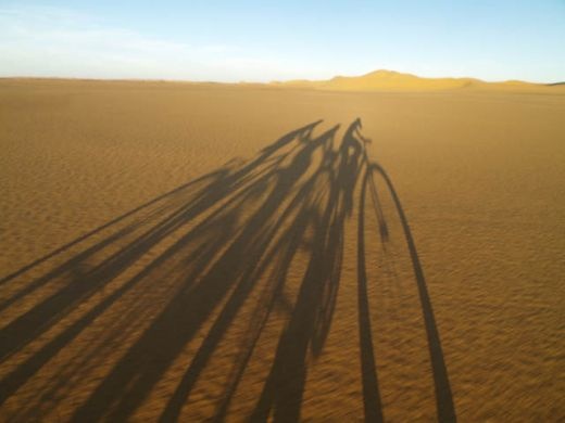 W morzu żużlu żwawo dąży trzech kolarzy na Saharze.