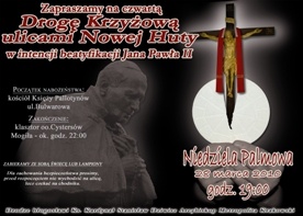 Zachęceni powodzeniem i popularnością nabożeństwa w latach ubiegłych, podjęliśmy się kontynuowania tego wielkiego dzieła również w tym roku. Serdecznie zapraszamy Was wszystkich do udziału w Drodze Krzyżowej. Odbędzie się ona 28 marca, w Niedzielę Palmową. Rozpoczęcie: o godzinie 1900 w kościele MB Pocieszenia przy ulicy Bulwarowej w Krakowie, a zakończenie około godziny 2200 w klasztorze oo. Cystersów w Mogile.