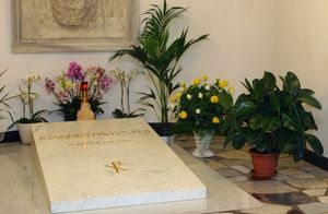 Wiele osób zatrzymuje się na chwilę modlitwy. Wokół płyty nagrobnej ustawiono bukiety kwiatów.