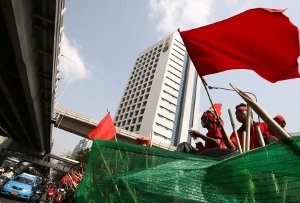 Tysiące demonstrantów, zwanych od swych ubiorów "czerwonymi koszulami", okupują luksusową dzielnicę handlową Bangkoku, rozciągającą się na ponad dwa kilometry. Sąsiednia dzielnica biznesowa obstawiona jest przez setki uzbrojonych żołnierzy.