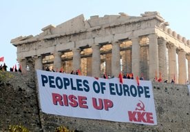 O świcie ok. 200 członków KKE sforsowało bramy prowadzące do głównej greckiej atrakcji turystycznej. Następnie demonstranci wywiesili transparenty w języku angielskim i greckim o treści "Ludy Europy - powstańcie". Nie doszło do interwencji policji. Protestujący nie utrudniali turystom wejścia na teren zabytku.