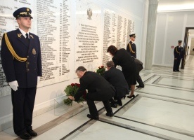 Po ceremonii zaprzysiężenia prezydent Bronisław Komorowski wraz z żoną Anną oraz marszałkami Sejmu Grzegorzem Schetyną i Senatu Bogdanem Borusewiczem złożył w piątek w Sejmie kwiaty przed tablicą upamiętniających parlamentarzystów poległych w II wojnie światowej.