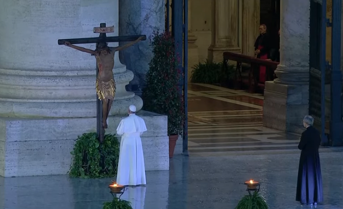 To było wstrząsające nabożeństwo. Papież sam podszedł w w strugach deszczu na miejsce przewodniczenia. Potem modlił się pod obrazem Salus Populi Romani i pod krzyżem z San Marcello. A potem adorował Najświętszy Sakrament i udzielił związanego z odpustem zupełnym błogosławieństwa Urbi et Orbi. Wszystko - do obejrzenia na filmie.