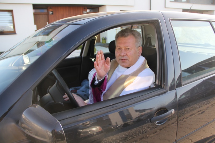 Ks. Maciej Spisz z parafii pw. NMP Różańcowej w Kiełczowie od wczesnych godzin porannych w niedzielę wielkanocną jeździł samochodem po ulicach czterech miejscowości i błogosławił mieszkańców oraz przygotowane przez nich pokarmy na wielkanocny stół. - Zacząłem o 6.00 i mam zamiar skończyć do Mszy św. o 9.30 - mówił "Gościowi Wrocławskiemu".