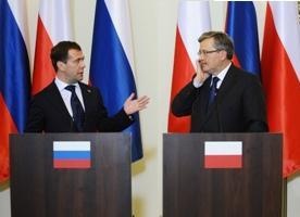 Komorowski na wspólnej konferencji prasowej dziękował swojemu gościowi za realizację ustaleń, co do których umówili się w kwietniu w czasie pogrzebu prezydenta Lecha Kaczyńskiego. "Chciałem publicznie podziękować za wykonanie naszych ustaleń, przez co rozumiem ważną bardzo deklarację, uchwałę Dumy rosyjskiej w sprawie Katynia" - mówił Komorowski.