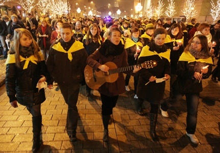 Młodzi ludzie, którzy zgromadzili się w krypcie katowickiej katedry, odśpiewali Apel Jasnogórski, a potem rozważali fragmenty wypowiedzi Jana Pawła II kierowanych przezeń do młodzieży - poświęconych m.in. sile wiary, pięknu życia czy wolności. W trakcie spotkania zebrani wyszli też ze świecami przed katedrę, by przed stojącym tam papieskim pomnikiem o godz. 21.37 odmówić dziesiątkę różańca i zaśpiewać Barkę.
