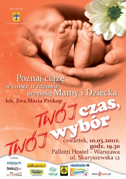Zapraszamy na kolejne spotkanie z cyklu Twój czas, Twój wybór na temat: „Poznaj ciążę w trosce o zdrowie przyszłej Mamy i Dziecka", które odbędzie się 10 marca 2011 roku o godz. 19.30 w Pallotti Hostel na ul. Skaryszewskiej 12. Spotkanie poprowadzi
