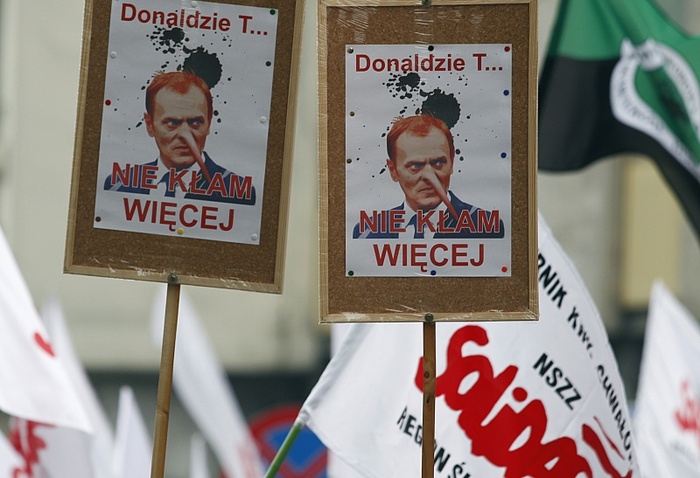 W tłumie widać było sztandary m.in. Solidarności, Związku Zawodowego Górników w Polsce i Sierpnia 80. Na transparentach umieszczono hasła: "Balcerowicz nie może wrócić", "Reformatorów emerytalnych zapraszamy na dół", "Stop prywatyzacji", czy "Bunt niewolników". Skandowano hasła: "złodzieje, złodzieje" i "Dziś Platforma, jutro wojna".