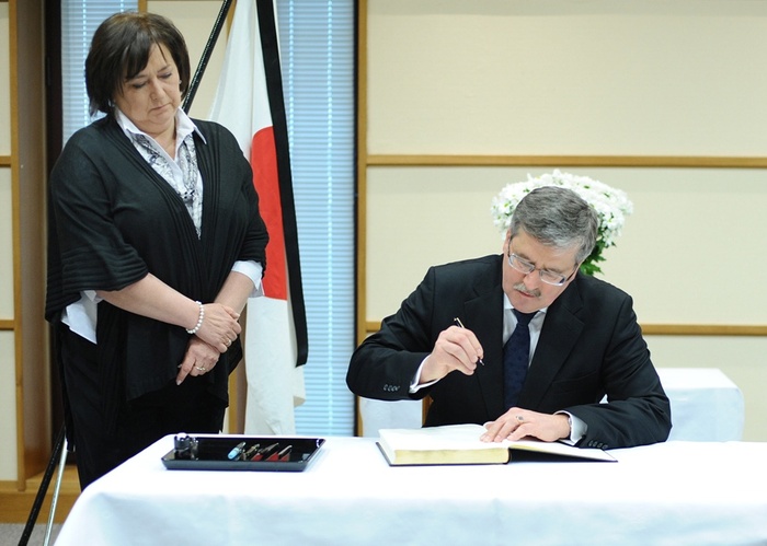 W czwartek Komorowski wraz z małżonką Anną wpisali się do księgi kondolencyjnej, wystawionej w związku z katastrofą w Japonii spowodowaną trzęsieniem ziemi i falą tsunami. Prezydent napisał: "Jednoczymy się w imieniu całej Polski z narodem Japonii w bulu i nadzieji na pokonanie skutków katastrofy".