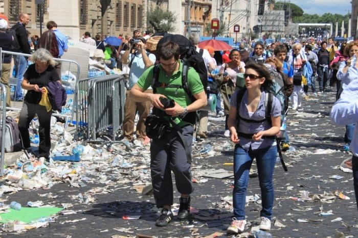 Z tego powodu wierni wychodzący z Placu św. Piotra dosłownie brnęli w śmieciach. Idąc ulicą lub chodnikiem, nietrudno było potknąć się o butelkę z niedopitą wodą czy nawet poślizgnąć na resztkach jedzenia. Przed uroczystościami pracownicy różnych firm rozdawali także mnóstwo folderów reklamowych, za darmo były też dystrybuowane specjalne wydania gazet. Wiele z nich leżało potem w stertach na ulicach.