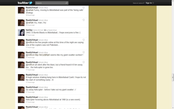 Specjalista od IT Sohaib Athar został w nocy obudzony przez hałasujące śmigłowce. Usiadł do komputera i napisał na Twitterze: "Śmigłowce latają nad Abbottabadem o 1 w nocy (rzadkie wydarzenie)". Potem w ten sam sposób poinformował o eksplozji, nie wiedząc, że to Amerykanie wysadzają w powietrze jeden ze swoich śmigłowców, który uległ awarii. "Potężny wybuch zatrząsł oknami w Abbottabad. Mam nadzieję, że to nie jest początek czegoś niedobrego :-S" – napisał Sohaib.