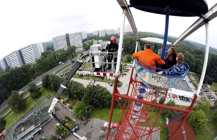 Część osób wróciła na ziemię dzięki specjalnemu wozowi bojowemu, którego wysięgnik osiąga długość 66 metrów. "Dziś ratowaliśmy ludzi na wysokości 40 metrów. Ta wysokość odpowiada 14. piętru w bloku" - wyjaśnił rzecznik chorzowskiej straży pożarnej, Arkadiusz Labocha.