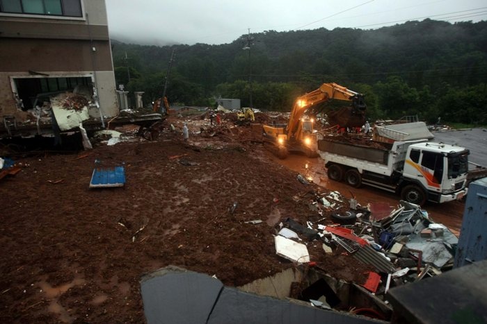 Ok. 20 osób odniosło obrażenia w Czunczeon, 70 km na wschód od Seulu, kiedy ściana błota uderzyła po północy w grupę budynków niedaleko tamy na jeziorze Soyang, w tym dwa hotele, restaurację i kawiarnię. Według lokalnych mediów, w chwili przejścia lawiny błotnej w hotelach znajdowało się ok. 75 osób.
