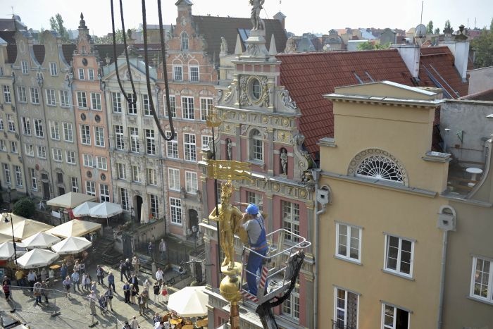 Mierzącą ok. 15 metrów i ważącą ok. 9 ton konstrukcję posadowiono na ratuszowej wieży przy pierwszym podejściu. "W tej chwili szczyt podczepiony jest jeszcze do dźwigu, który podtrzyma go do czasu przytwierdzenia konstrukcji do wieży" - powiedziała PAP Monika Kryger, rzeczniczka mającego swoją siedzibę w ratuszu Muzeum Historycznego Miasta Gdańska.