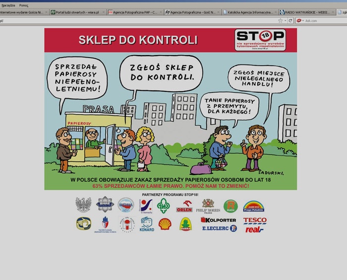 W program „STOP18!” włączyło się do tej pory dwieście samorządów i 102 straże miejskie. Strażnicy będą kontrolować punkty sprzedaży, co do których istnieją podejrzenia, że sprzedaje się tam papierosy nieletnim albo papierosy z przemytu. – Żeby ukarać za to sprzedawcę, trzeba by go chwycić za rękę – przyznaje koordynator Daniel Kucharski. – Jednak sama świadomość, że ktoś sprzedawcy w tej sprawie patrzy na ręce, działa pozytywnie. Będziemy też wręczać sprzedawcom materiały edukacyjne. W tym zawodzie jest duża rotacja, często osoba, która stoi za ladą, jest nowa w tym fachu. Poinformujemy ją, że ma prawo do żądania okazania dokumentu od klienta, który chce kupić papierosy. I że za sprzedanie wyrobów tytoniowych nieletnim grożą wysokie kary – zapowiada. Tegoroczna edycja programu potrwa do listopada.