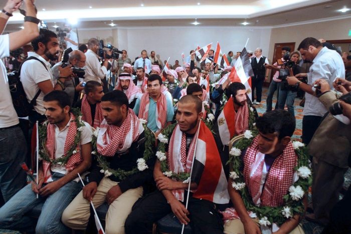 Egipska telewizja państwowa pokazała, jak niektórzy z uwolnionych klękają, by ucałować asfalt po przekroczeniu granicy z Egiptem. Prezenter nazwał byłych więźniów "bohaterami" i "jeńcami wojennymi".