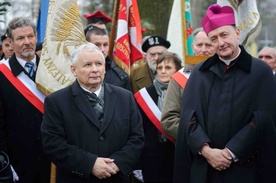 Prezes PiS Jarosław Kaczyński (L) i biskup tarnowski Andrzej Jeż (P) podczas ogólnopolskich obchodów 140. rocznicy urodzin Wincentego Witosa w rodzinnej wsi trzykrotnego premiera II RP - Wierzchosławicach, 19 bm.